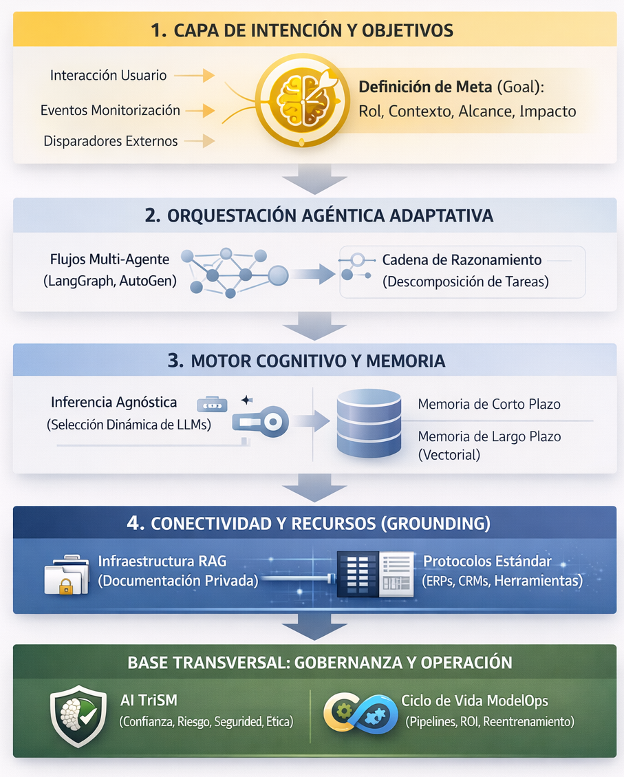 Nuestra infraestructura está diseñada para desacoplar los modelos de inteligencia de las herramientas de ejecución, permitiendo una adaptabilidad total ante la obsolescencia tecnológica.