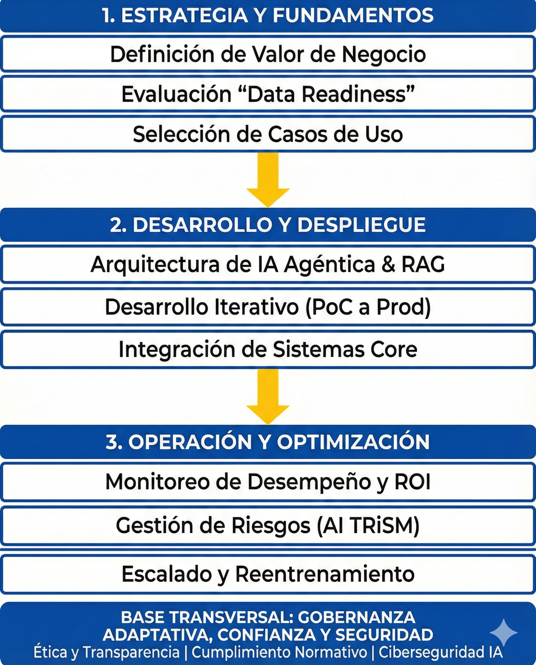 Automatizamos el despliegue, monitoreo y reentrenamiento de soluciones mediante pipelines de ModelOps, integrando la gobernanza AI TRiSM en cada etapa para mitigar riesgos de deriva del modelo o vulnerabilidades de seguridad en tiempo real.
